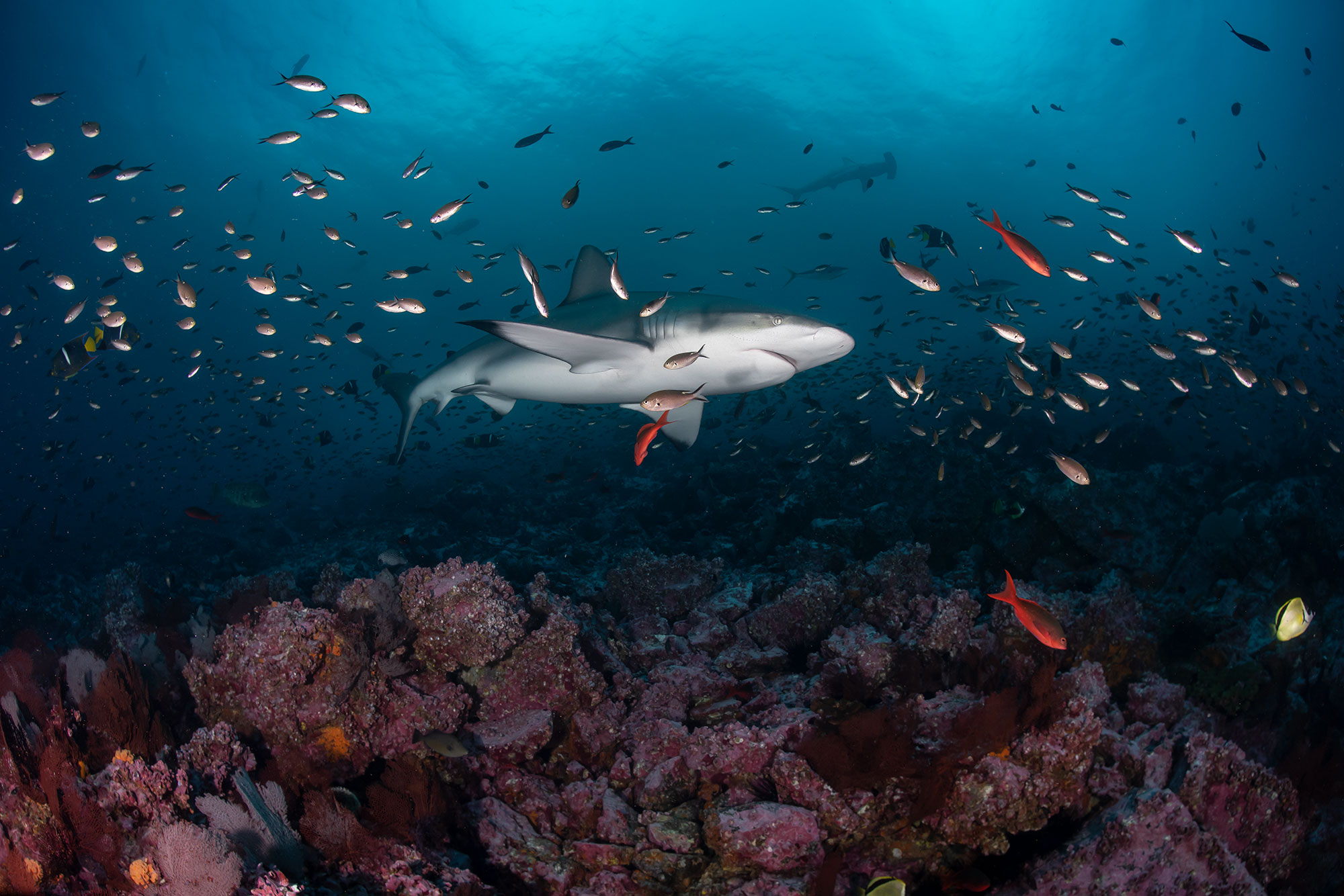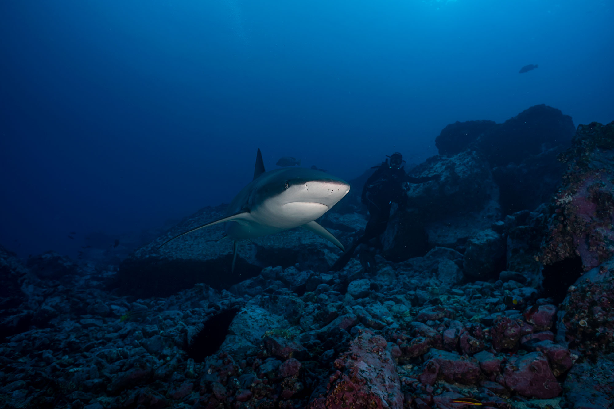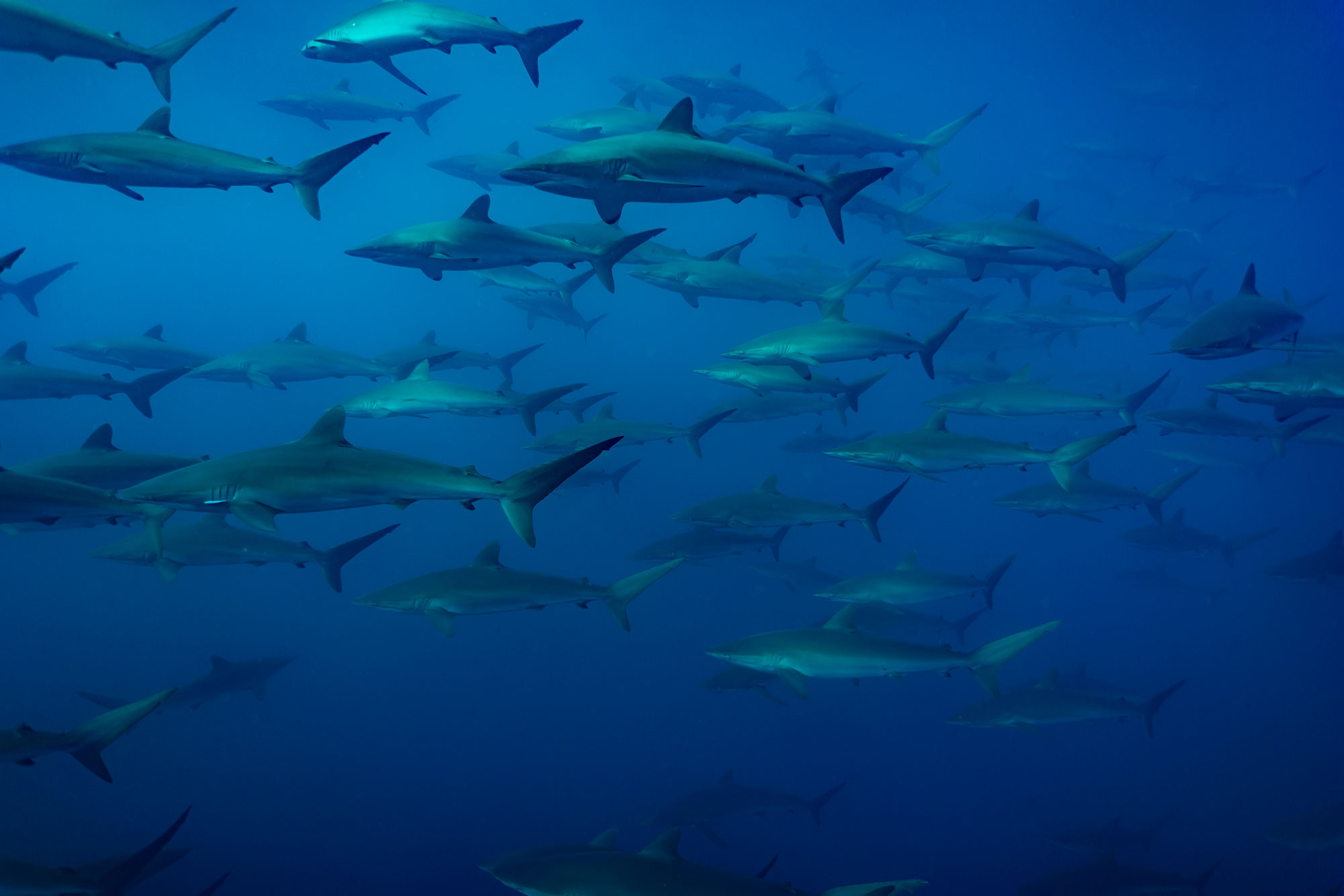 Galapagos-Haie sind die dritte vorherrschende Hai Art und sind an fast allen Riffen und Felsen vor Malpelo zu finden. Die bis zu 3 Meter langen Tiere sind imposante Räuber und haben ein dementsprechend selbstbewusstes Auftreten. An einem Tauchplatz zwischen La Gringa und David konnten wir schon an einem tief liegenden Riff bis zu 20 Tiere zählen. Ein unvergessliches Erlebnis, wenn man da unten sitzt, den Galapagos-Haien zuschaut und einem gerade hundert Hammerhaie über den Kopf schwirren.