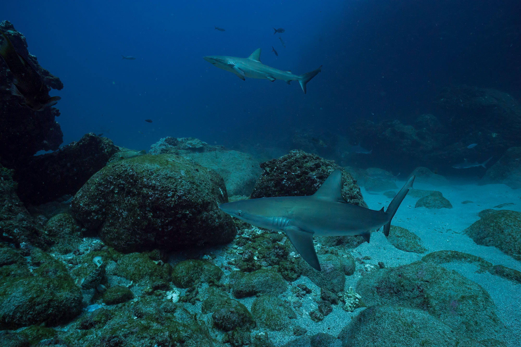 Steilwände und Felsformationen prägen die Tauchplätze an den Inseln. Der Bewuchs ist zwar meist sehr spärlich, aber die Mantas, Walhaie, Hammerhaie, Silberspitzhaie, Seidenhaie usw. entschädigen ausreichend für die karge Unterwasserwelt.