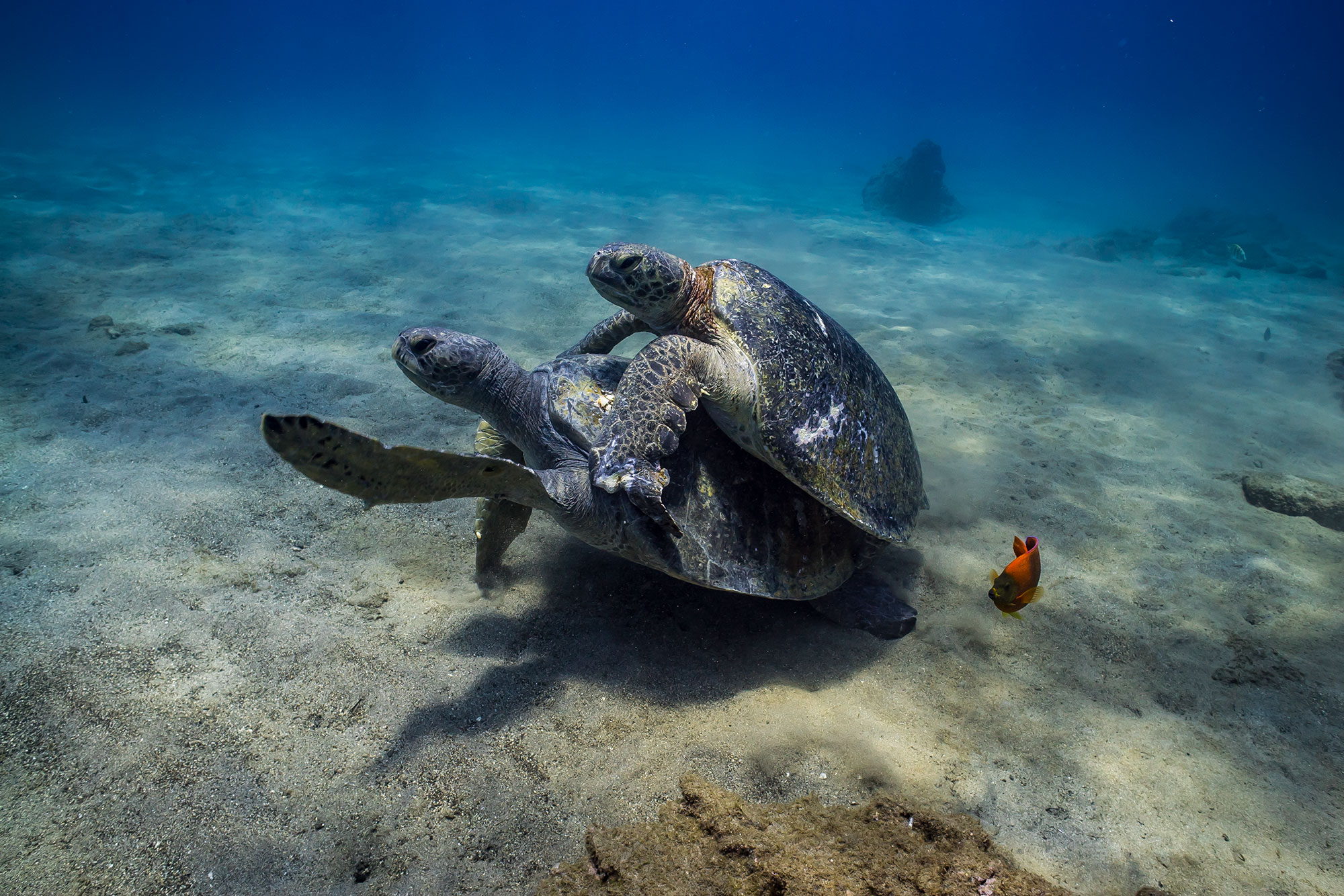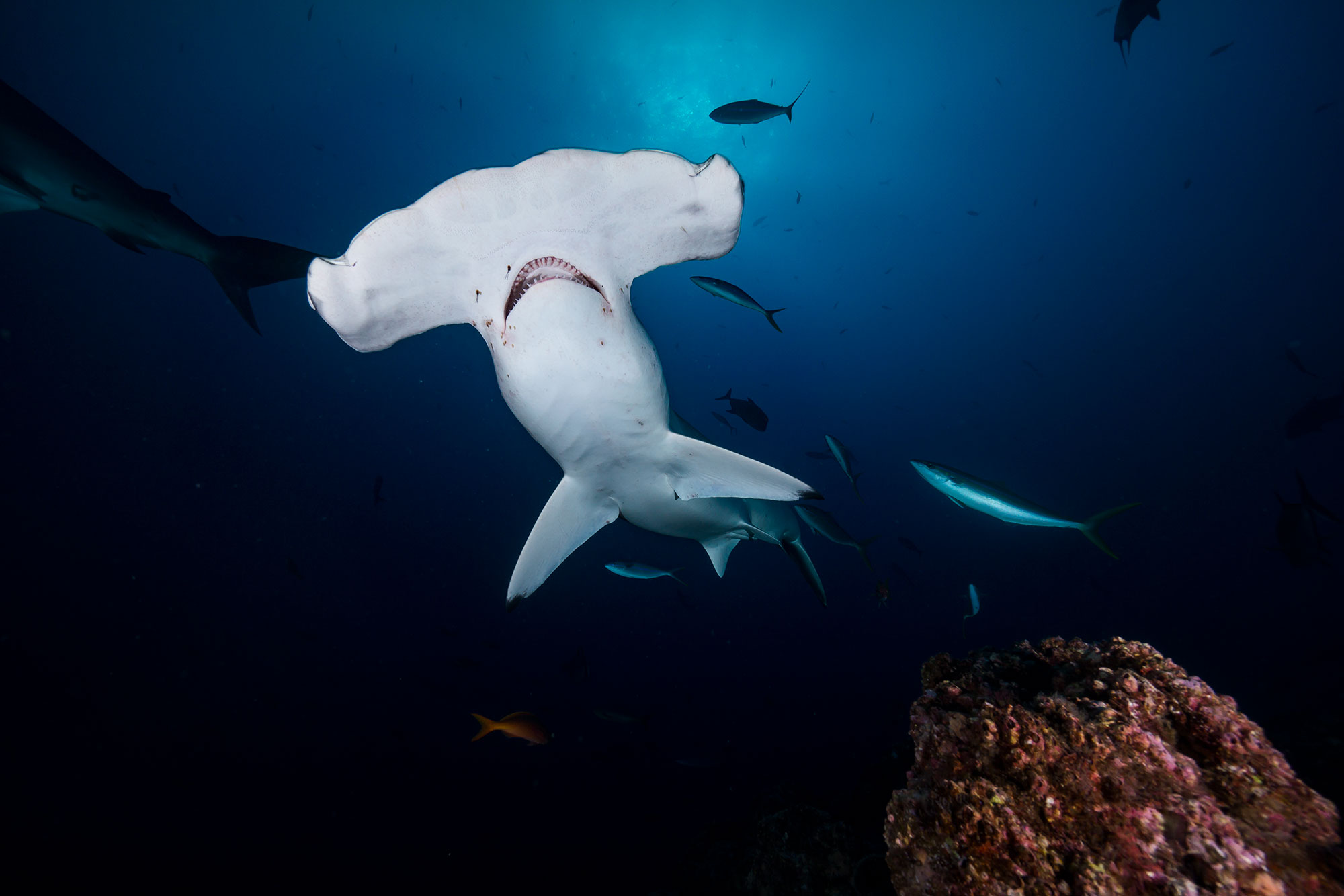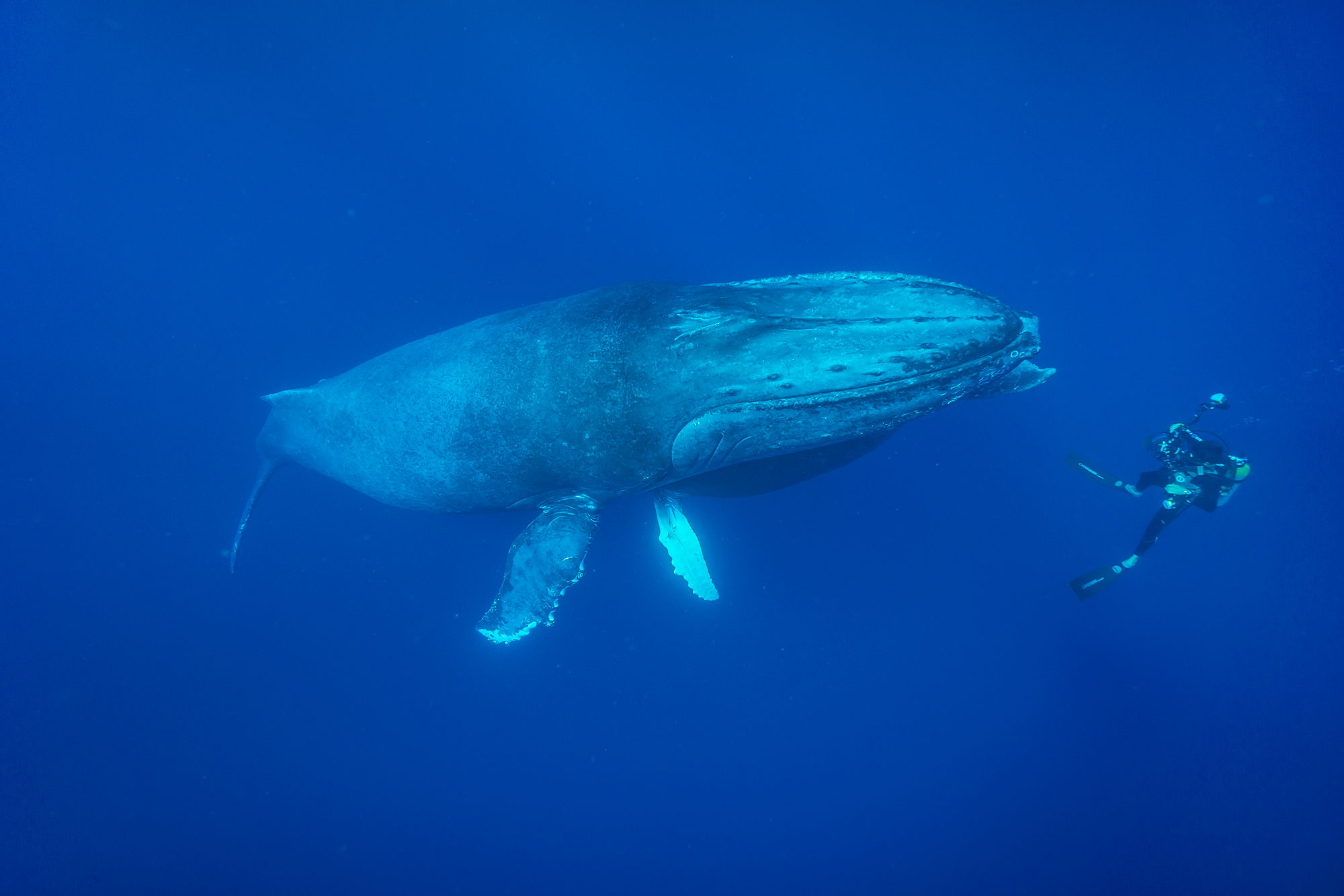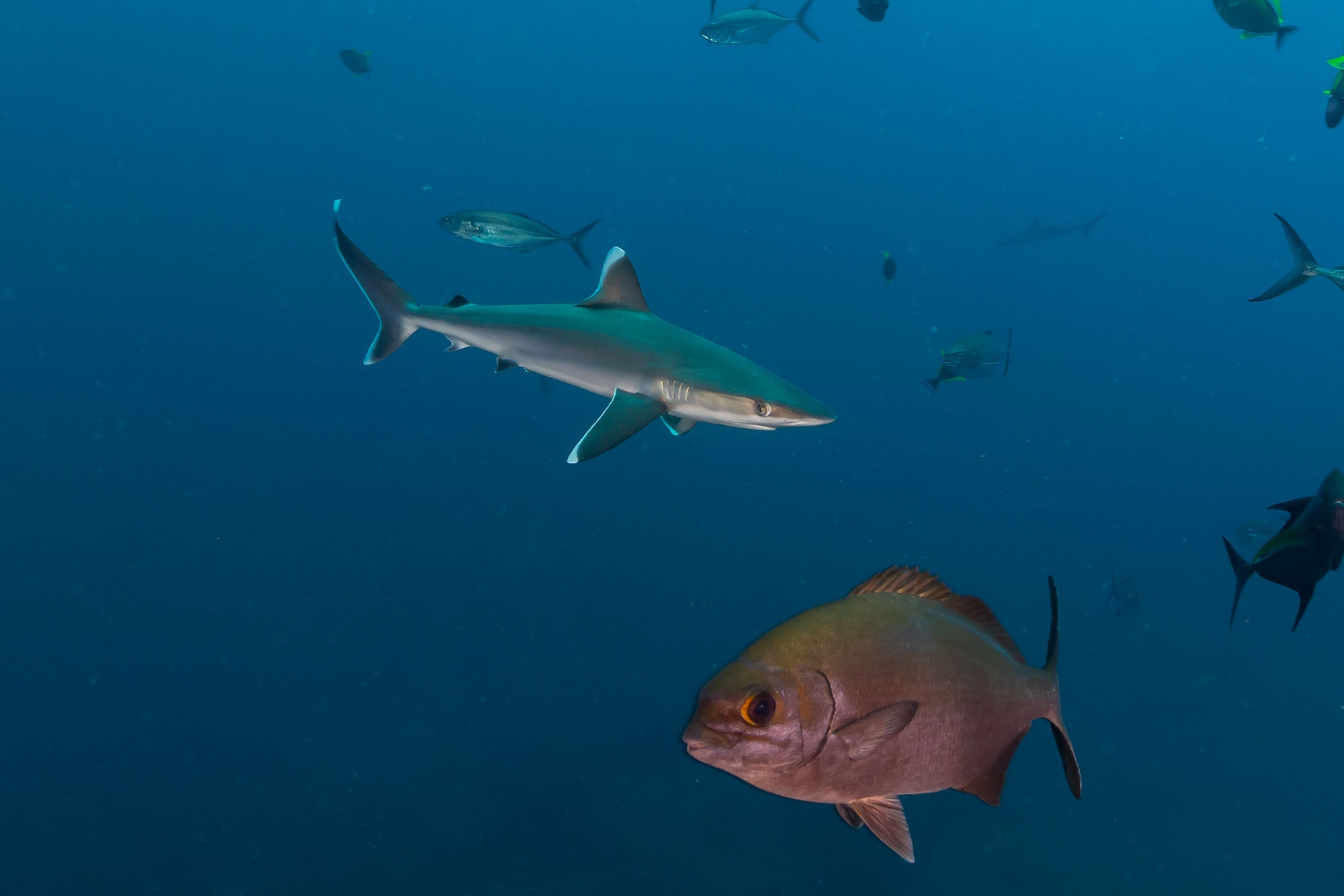 Walhaie sind keine Seltenheit und von Februar bis April gesellen sich Buckelwale hinzu, die hier ihre Kälber gebären oder sich erneut paaren. Immer öfters kommt es zu Sichtungen beim Tauchen. Im März/April, wenn die Buckelwale langsam ihre Aktivitäten einstellen, kann man beobachten, dass die Neugier der Meeressäuger für Taucher ansteigt und es immer häufiger möglich wird, mit den Tieren zu schnorcheln. Generell ist in diesen Gewässern alles möglich und wen wunderts, wenn plötzlich ein Marlin vor der Linse auftaucht oder ein großer Thunfischschwarm durchs Blauwasser zieht.