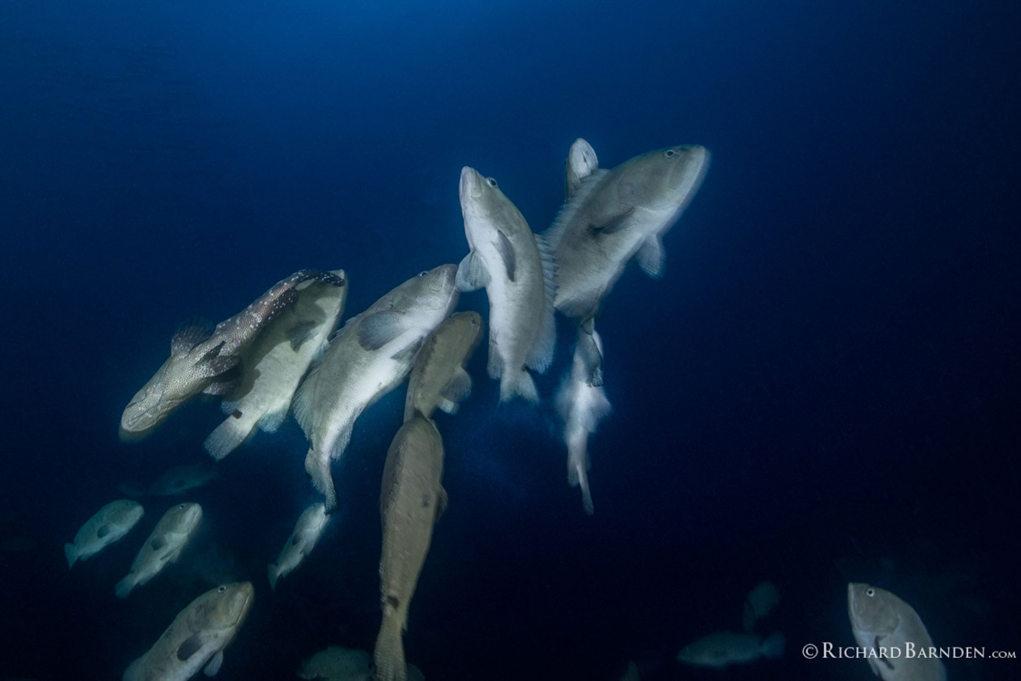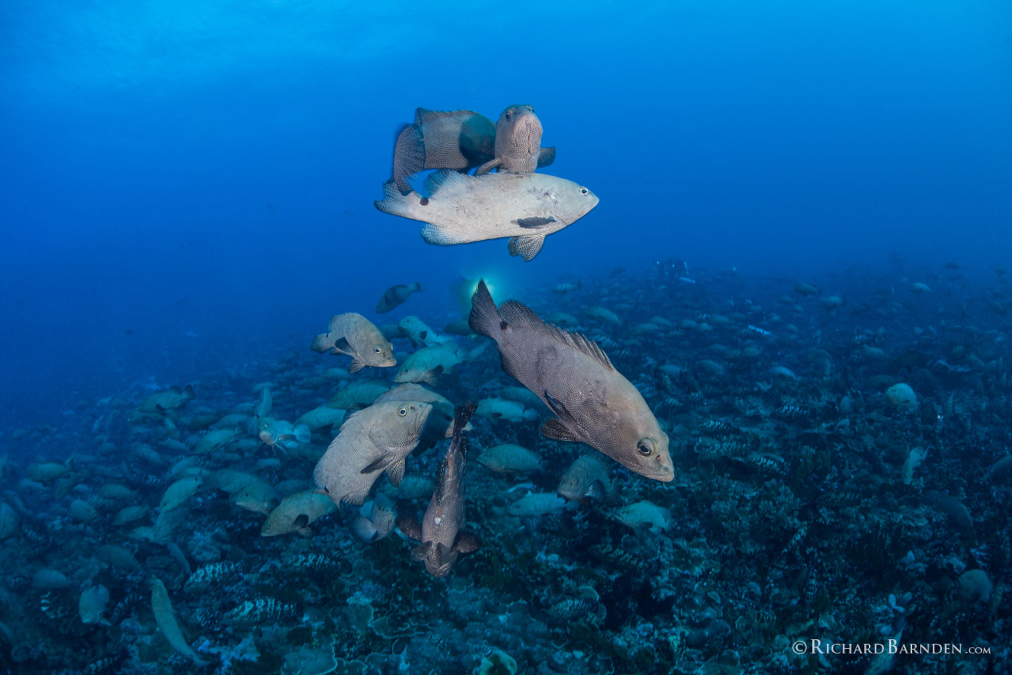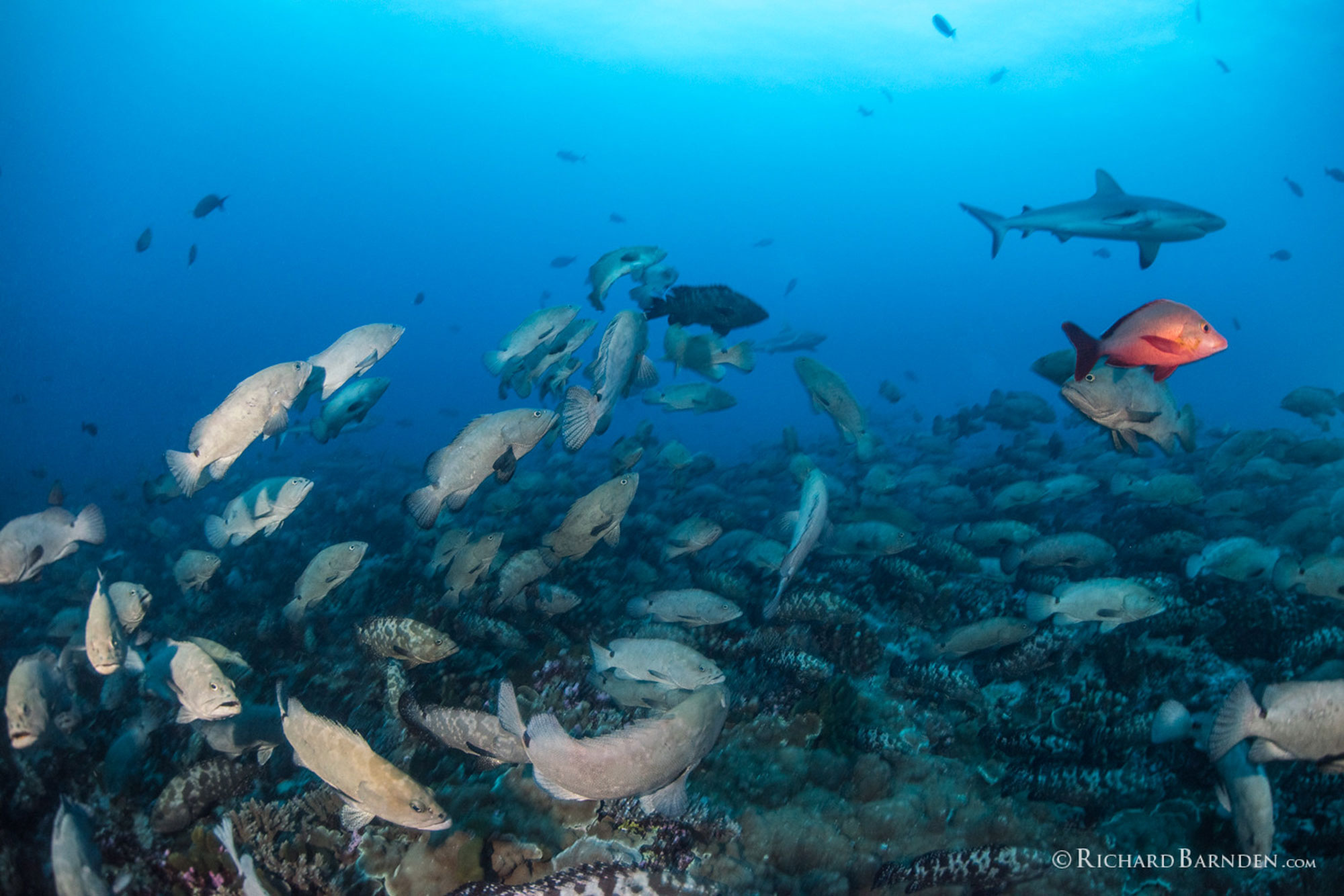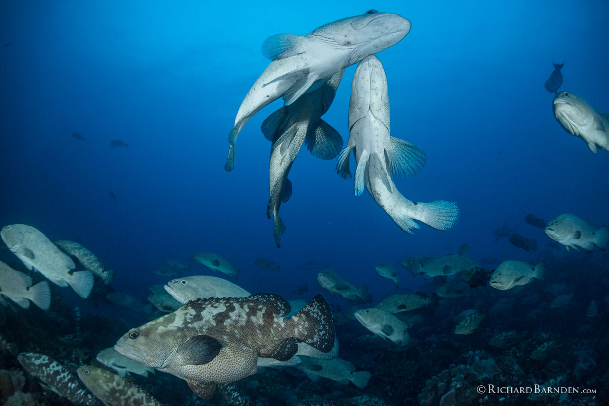 Das absolute Top Event in Polynesien – Das Grouper Spawning am Fakarava Südpass. Jedes Jahr in den Monaten Juni / Juli zu Vollmond versammeln sich abertausende Grouper zur Eiablage im kleinen Fakarava Süd Pass. Wohin das Auge reicht erblickt man die majestätischen Zackenbarsche die ansonsten meist solitär an den Riffen an zu treffen sind. Fressen und gefressen werden – Die riesige Ansammlung der Barsche und die Freigabe von Millionen an Fischeiern während der Eiablage, zieht unzählige Räuber an. Vom kleinen Rifffisch der scharf auf die Eiablage ist bis zu den Haien dehnen ein Zackenbarsch der abgelenkt ist, als Snack gerade recht kommt.