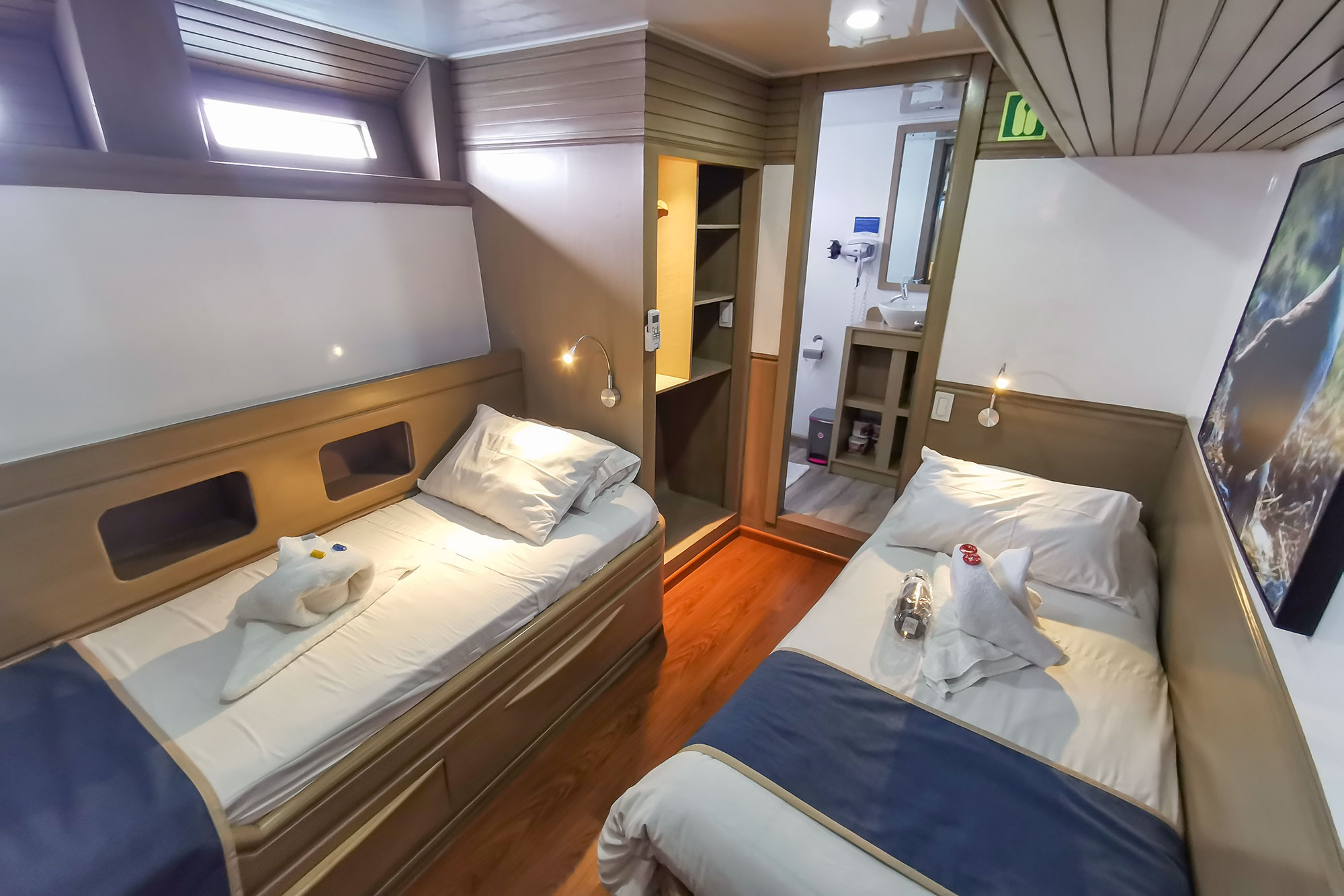 Die Calipso verfügt über 9 Kabinen für max. 16 Gäste. Alle ca. 11 qm großen Kabinen sind ausgestattet mit individuell regulierbarer Klimaanlage, TV, Föhn, Ablageflächen/Schubladen und privatem Bad (Dusche/WC). In den Doppelkabinen können die Betten als Einzelbetten oder als Doppelbett konfiguriert werden. In den Einzelkabinen handelt es sich um Einzelbetten in Stockbauweise.