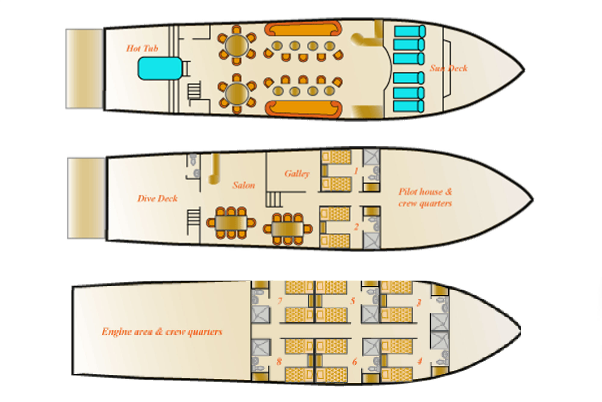 - 6 Kabinen im Unterdeck mit kleinen Fenstern