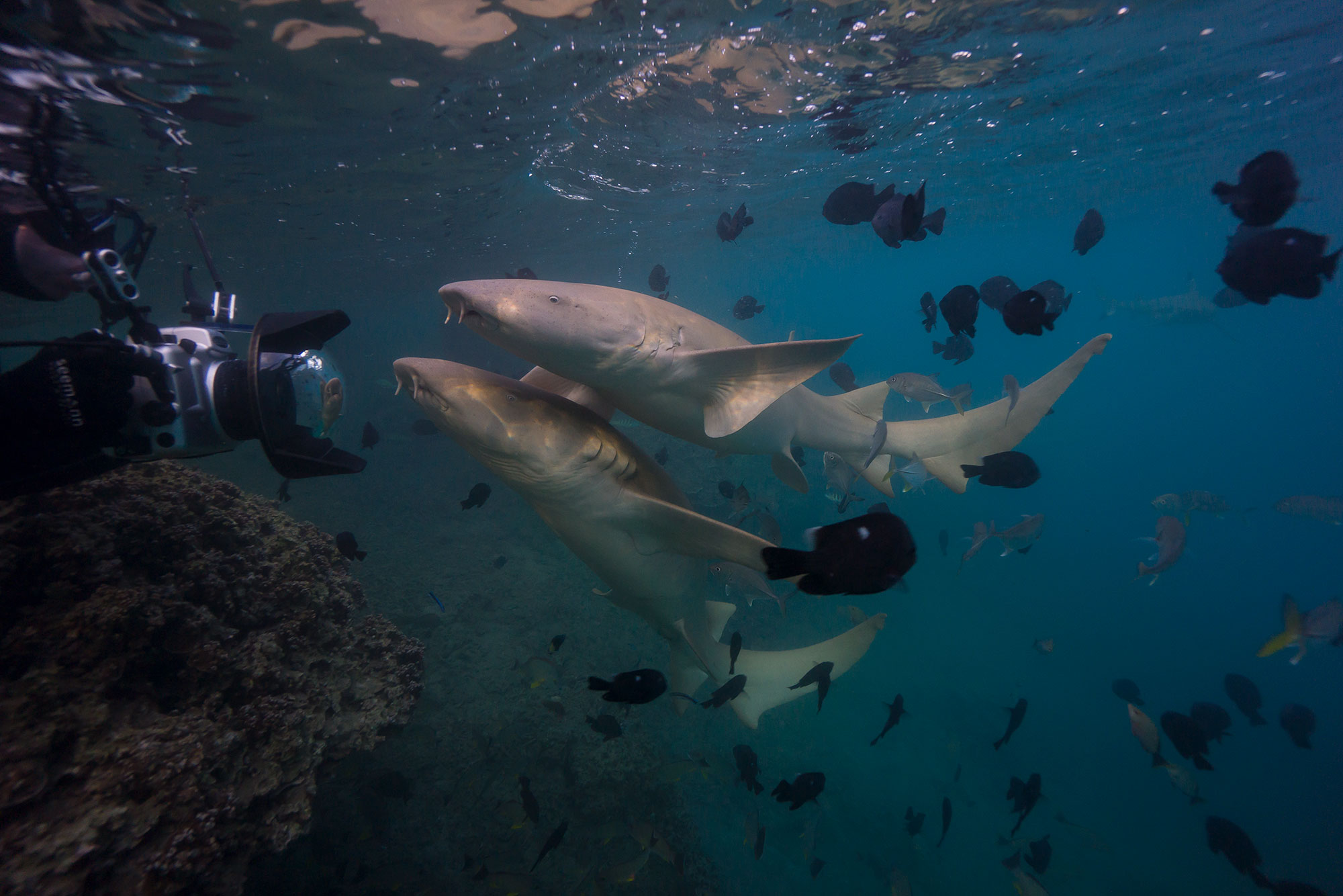 Die bekanntesten Tauchplätze Mooreas befinden sich rund um die Opunohu und die Cooks Bay. Für diese Tauchplätze erfolgt der Transfer zuerst mit dem Pick up an eine Anlegestelle weiter nördlich und dann mit dem Tauchboot zu den Tauchplätzen, wie dem Außenrifftauchplatz „Tiki“, an dem man Schwarzspitzriffhaie und Graue Riffhaie beobachten kann oder zu schönen Korallenplätzen, wie „Les Roses“. Eine Attraktion sind die Zitronenhaie am Lemon Shark Valley. Hier werden mit Hilfe eines Thunfischkopfes die bis zu 4 Meter großen Zitronenhaie angelockt, die bis auf Armeslänge an die Taucher herankommen.