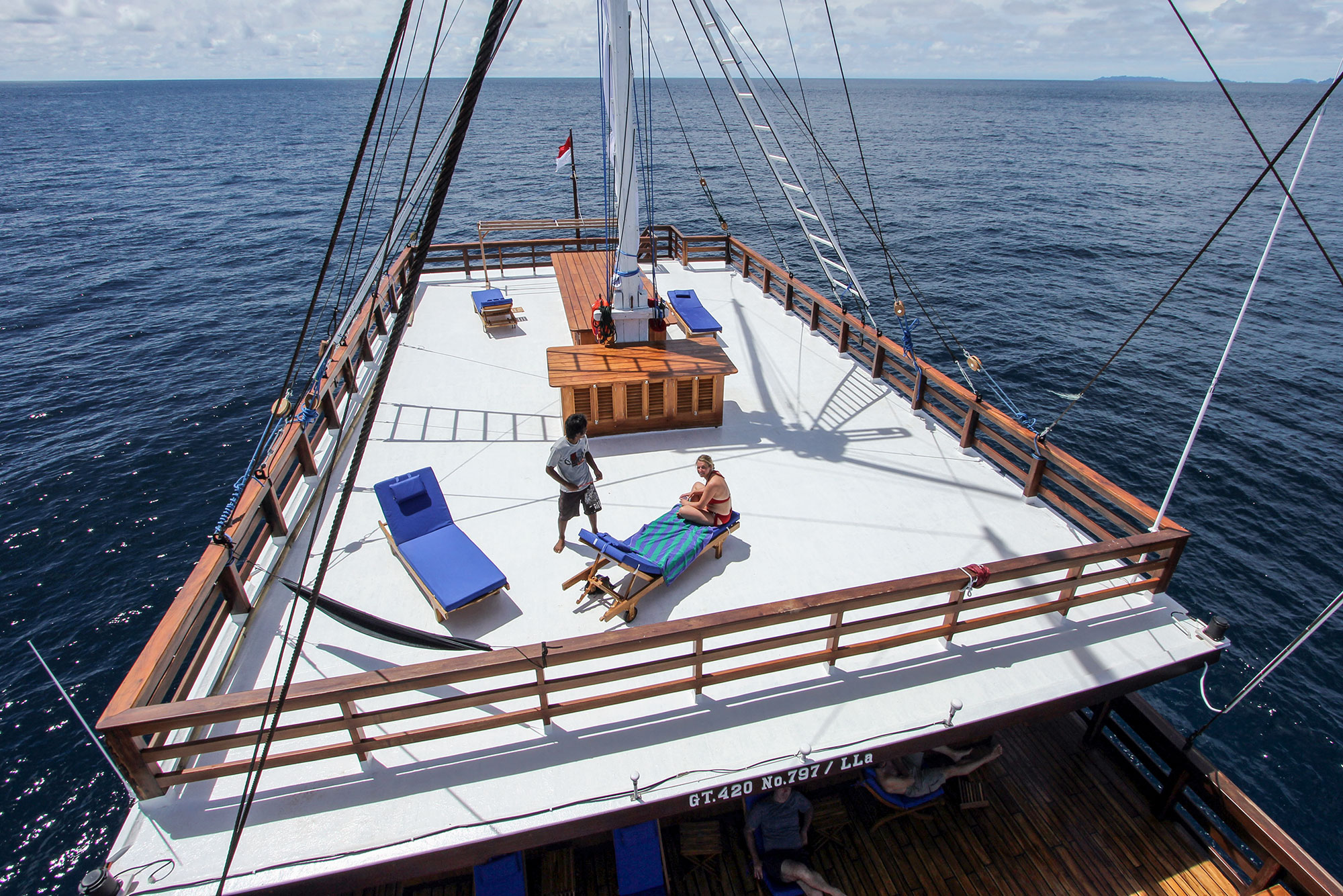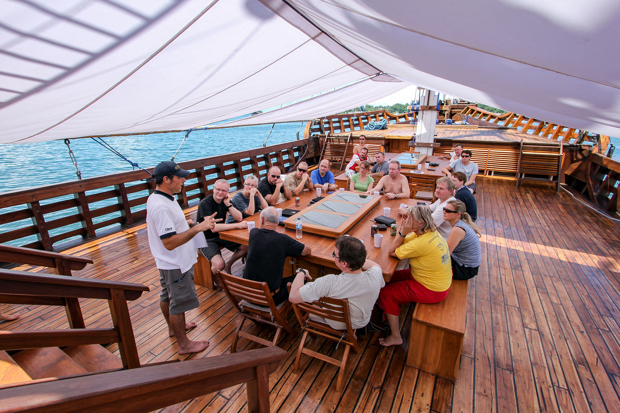 Das geräumige Tauchdeck auf dem Unterdeck bietet den Tauchern reichlich Platz. Je nach Tourverlauf werden pro Tauchtag bis zu 4 Tauchgänge (inkl. Nachttauchgang) angeboten.
