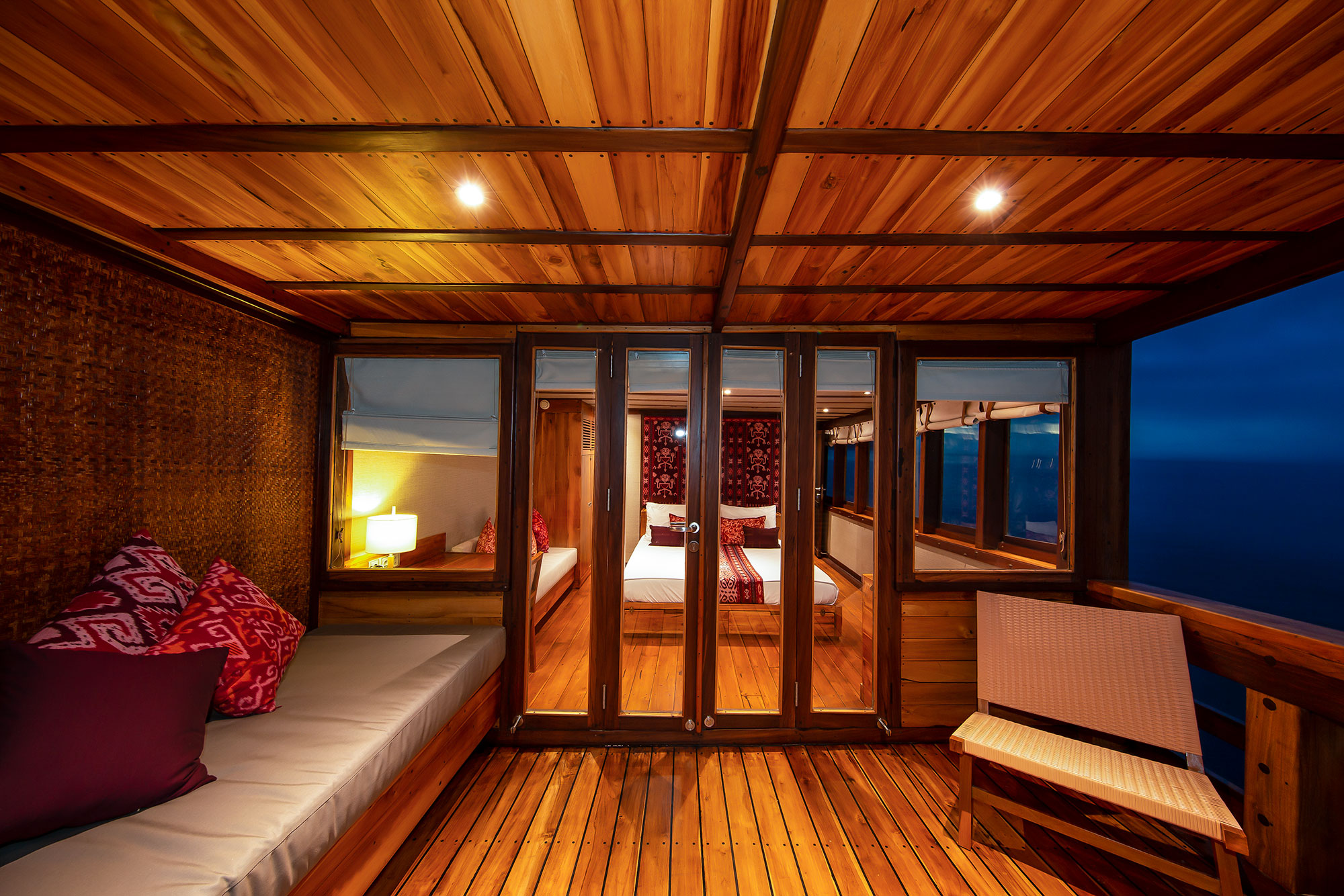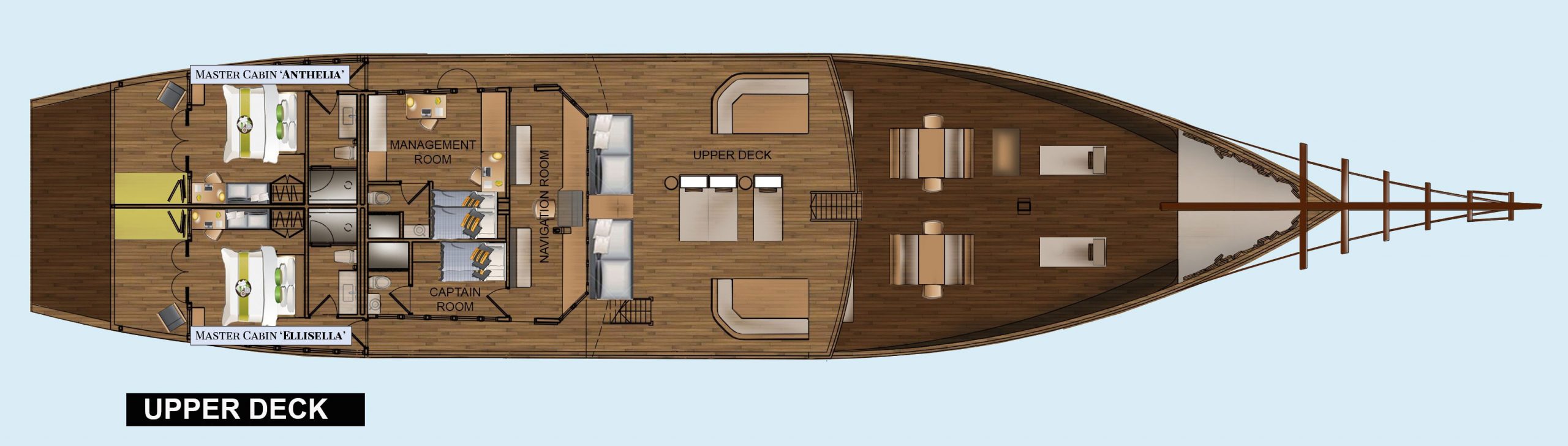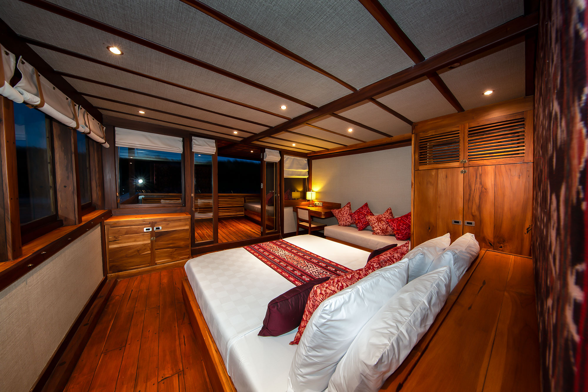 - 4 Master Kabinen (30 qm) auf dem Haupt- und Oberdeck mit Doppelbett, kleinem Schreibtisch, Fenster und Glasschiebetür zum privaten Balkon mit Sofa