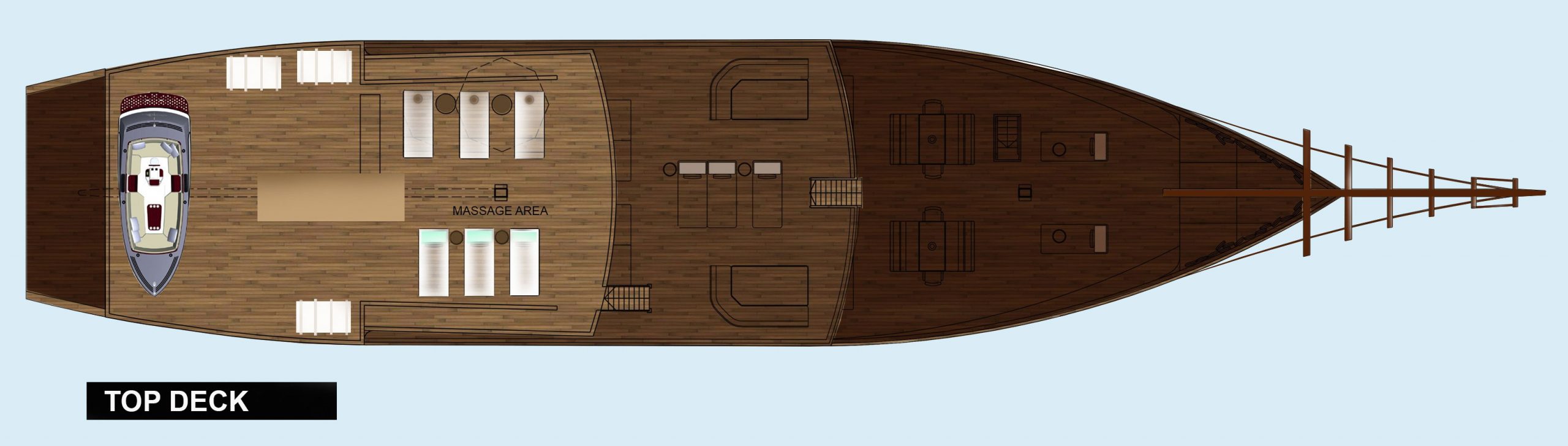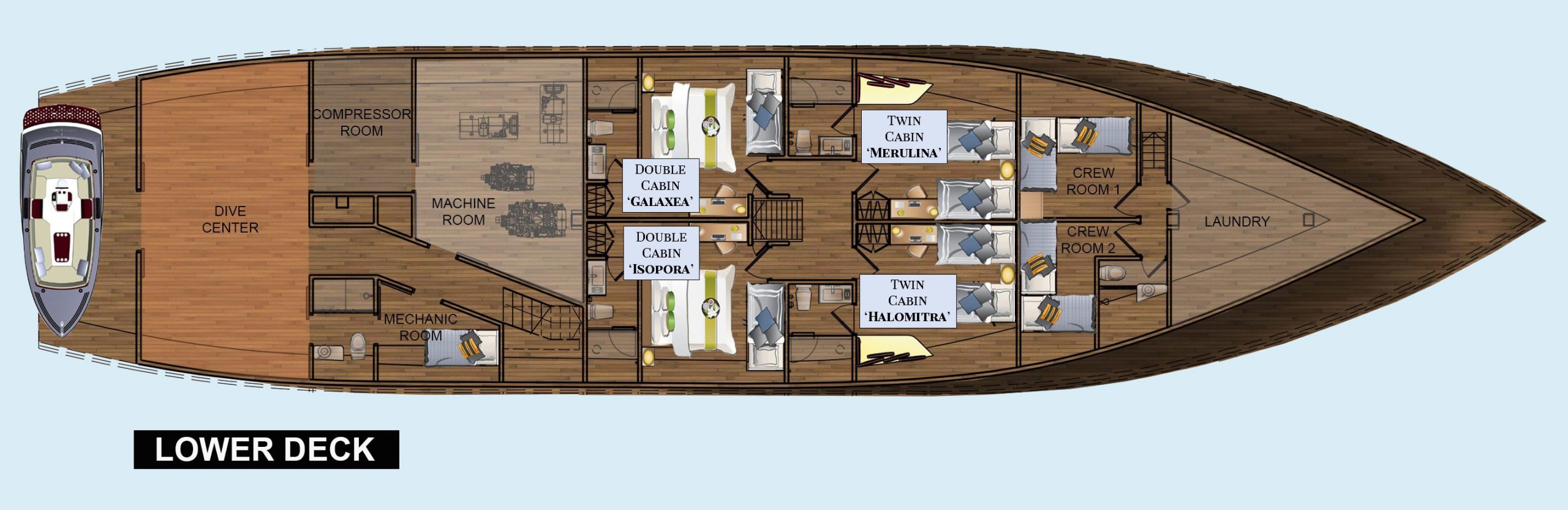 Auf dem großen Tauchdeck hat jeder Taucher seinen eigenen Platz für seine Tauchausrüstung. Es werden pro Tauchtag – je nach Tourverlauf – bis zu 4 Tauchgänge angeboten. Auf einen Tauchguide kommen max. 6 Taucher.