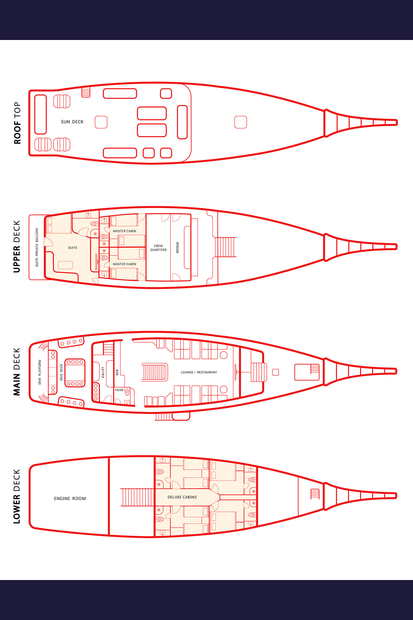 - 4 Master Kabinen (14qm) mit 2 einzelnen Betten oder einem Doppelbett