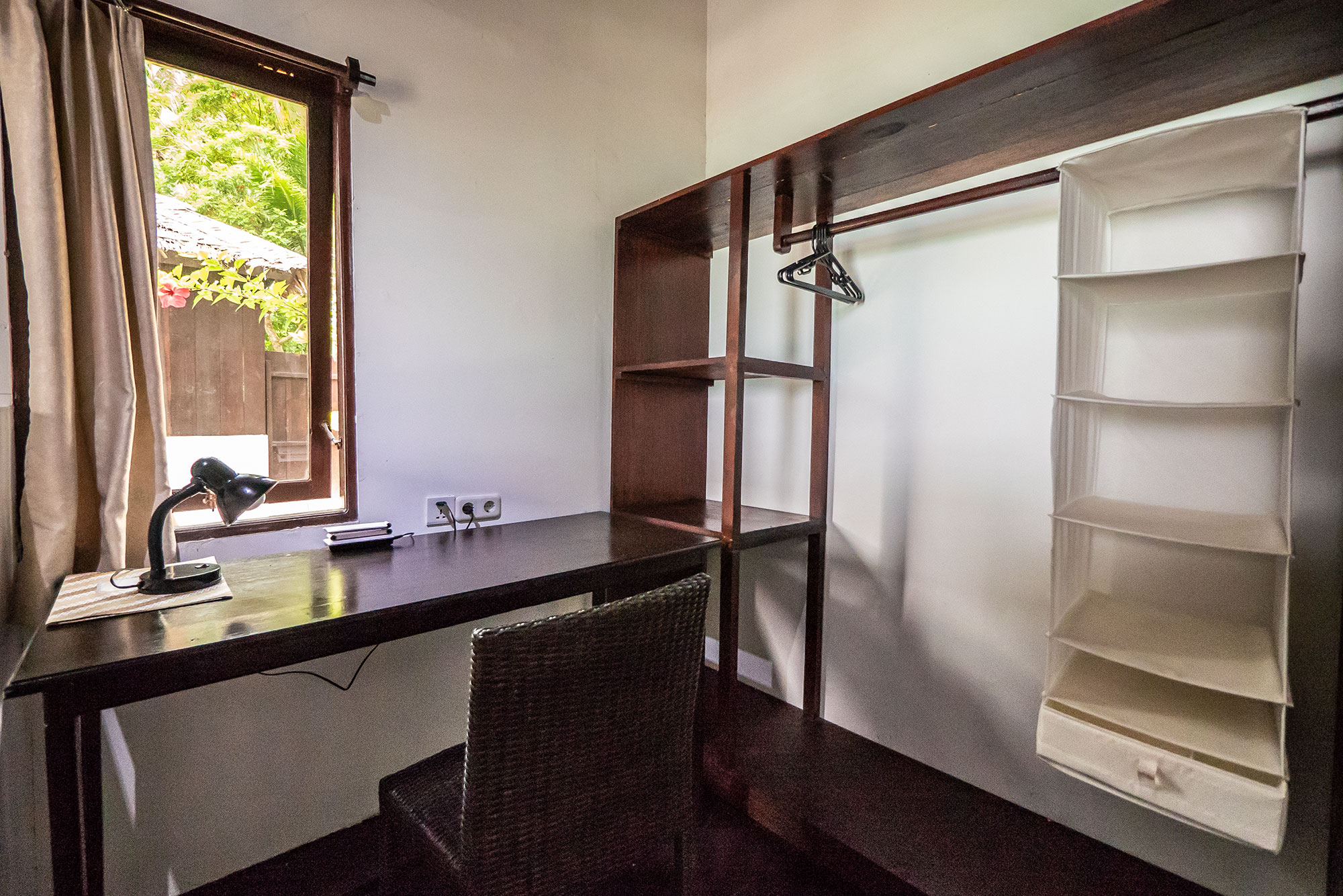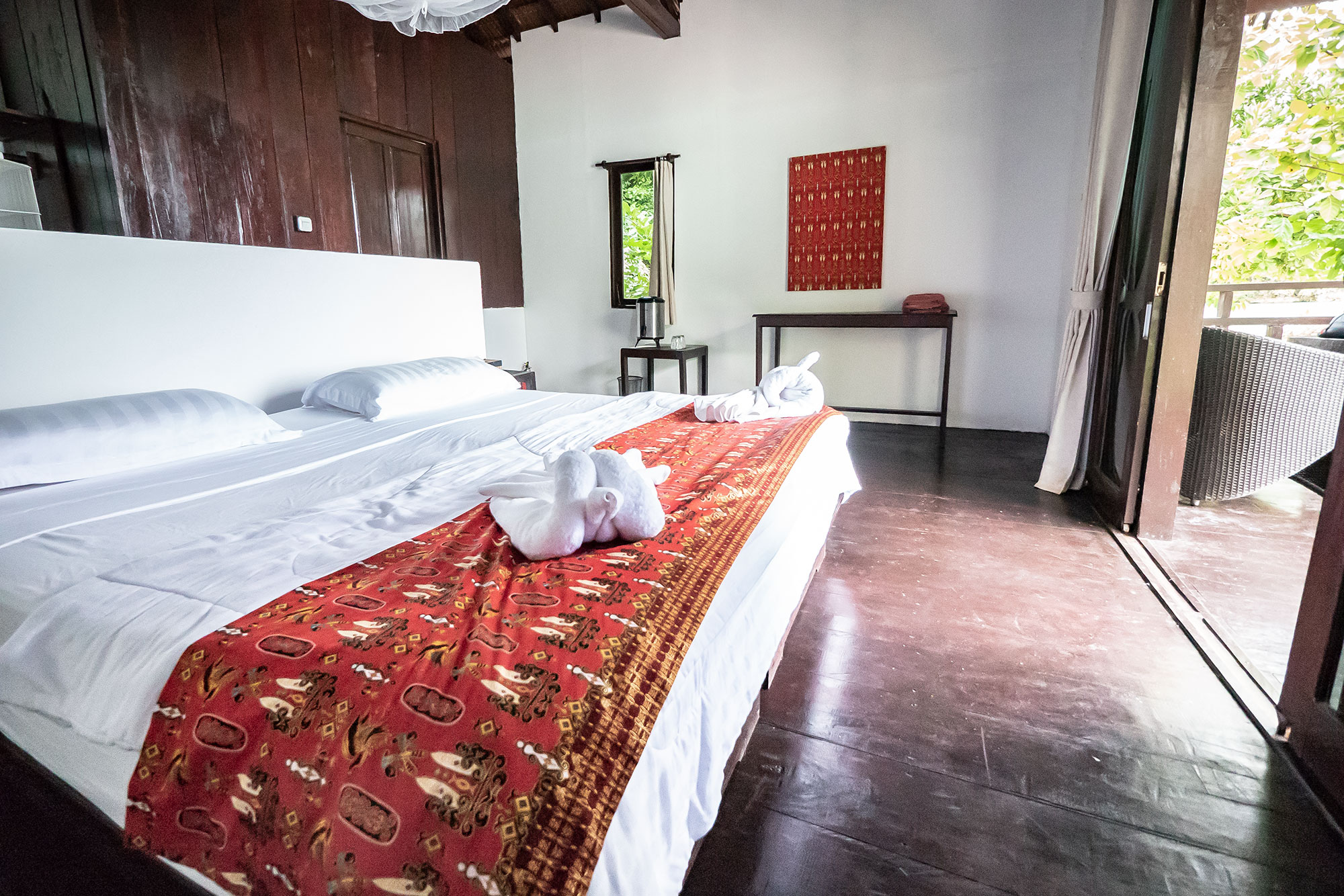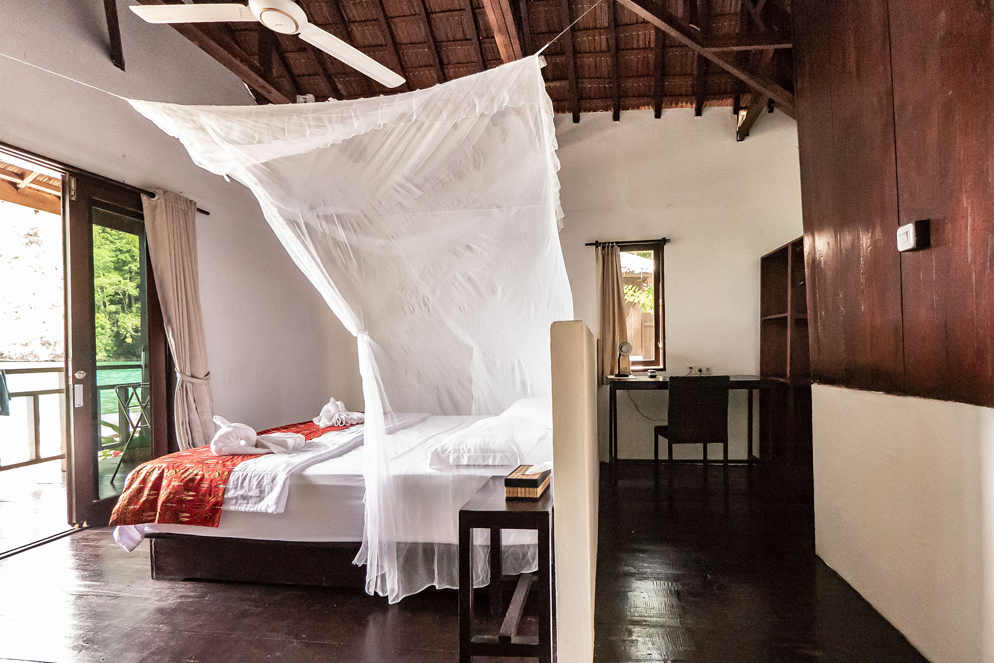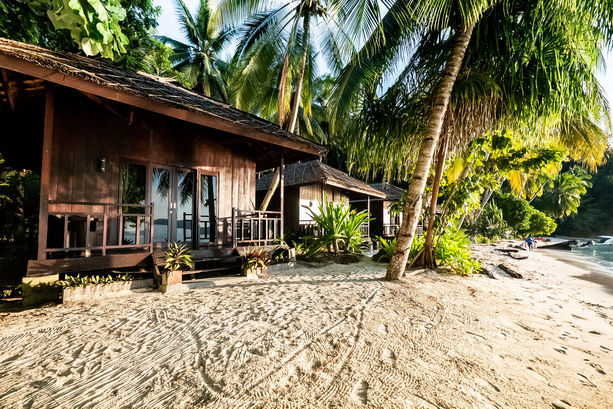 Die aus Holz gebauten 6 Bungalows liegen alle direkt am wunderschönen, naturbelassenen Strand und sind mit großem Ventilator, einem großen Doppel- und/oder einem Einzelbett mit Moskitonetz, einem Schreibtisch mit 220 Volt Steckdose, einem eigenen teiloffenen Badezimmer mit Heißwasser-Dusche und WC, sowie einer Terrasse mit Sitzmöglichkeiten ausgestattet. Das Resort ist sich seines ökologischen Fußabdruckes bewusst und baut nachhaltig mit natürlichen lokalen Materialien. Jedes Holz von Bäumen, das für den Bau entfernt werden musste, wurde im Resort mit lokalen Handwerkern und traditionellen Techniken auch verwendet. Aktuell gibt es eine Stromversorgung von 06:30 – 23:00 Uhr.