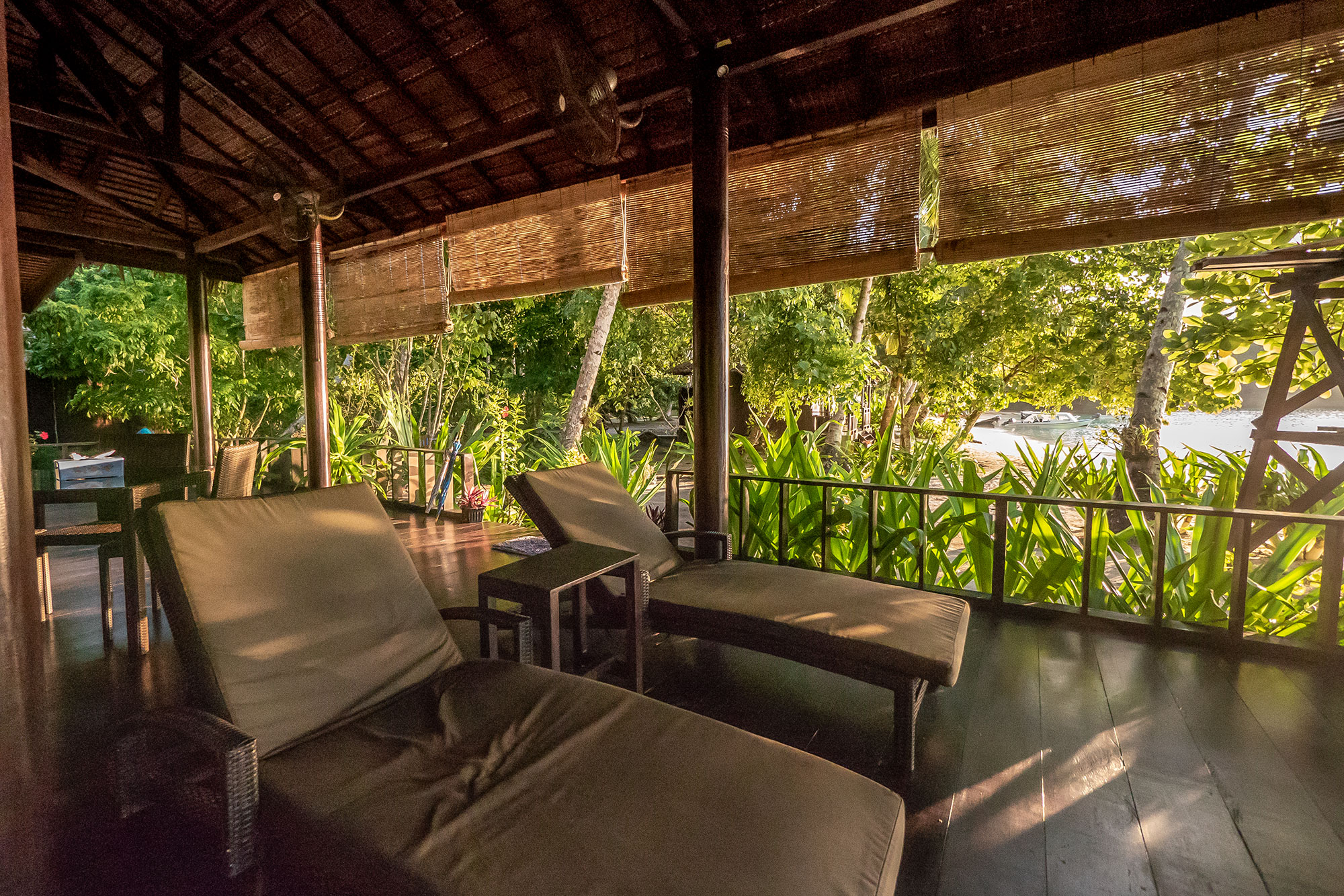 Auf der mit Kokospalmen gesäumten kleinen Anlage hat man einen herrlichen Blick über die Lagune. Die Sonnenliegen und eine Hängematte laden zum Relaxen und Träumen ein.