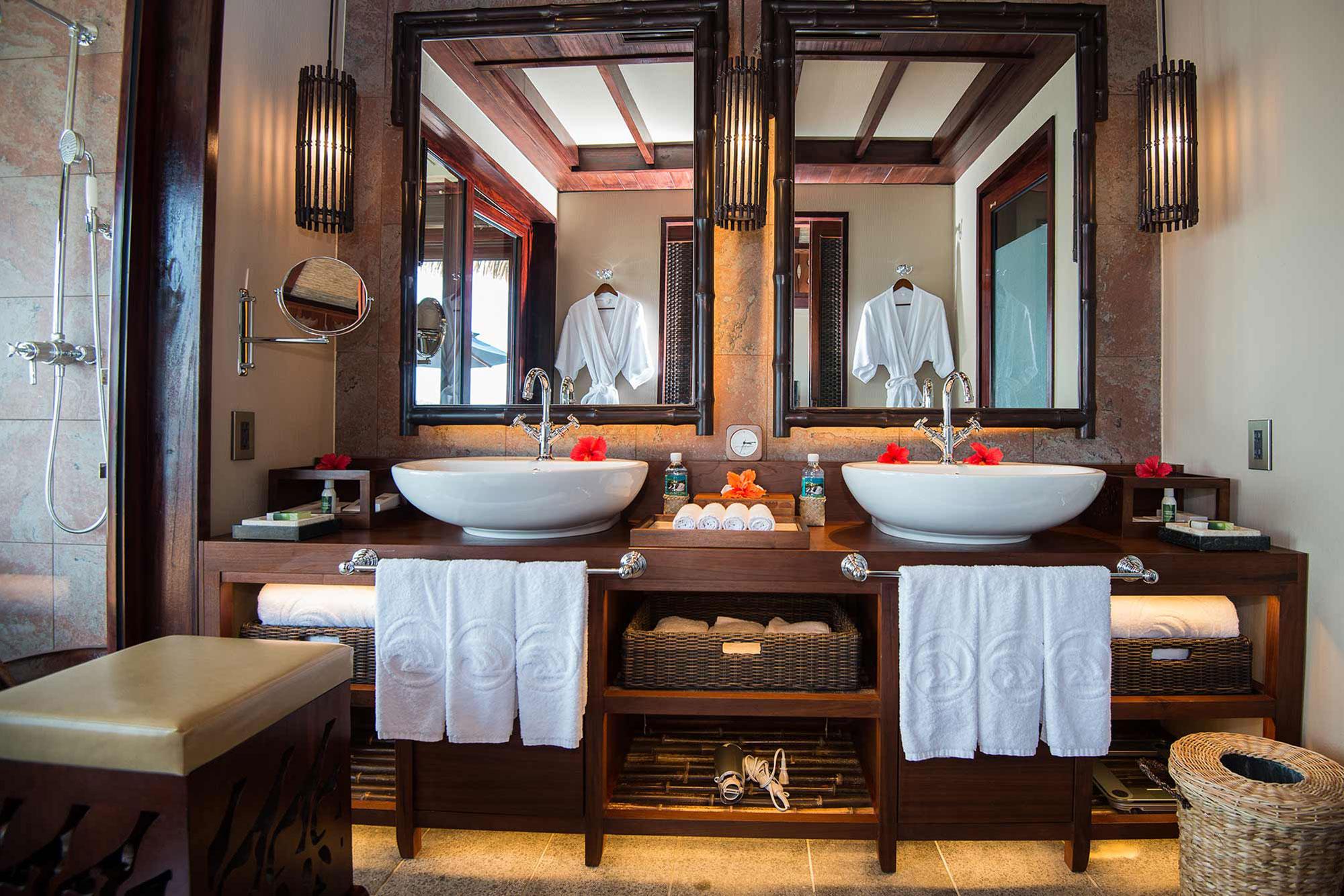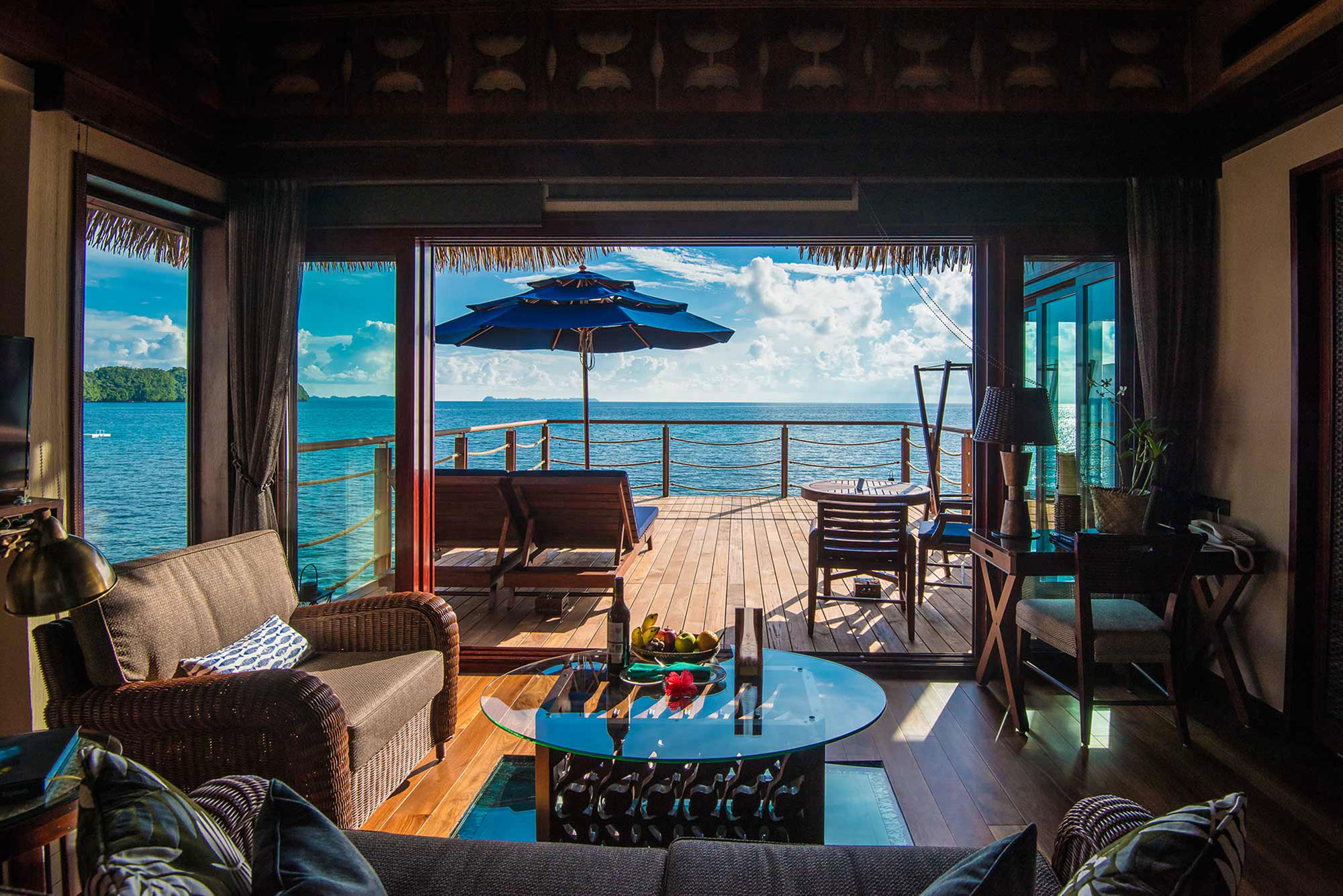 Mit den neuen 90 qm großen Wasserbungalows (53 qm das Zimmer und 37 qm die Terrasse) bietet das Resort einen herrlichen Blick auf den Pazifischen Ozean. Entspannen Sie in einer luxuriösen Privatsphäre und genießen Sie traumhaft schöne Sonnenuntergänge direkt von Ihrer eigenen Terrasse aus. Jeder Wasserbungalow verfügt über ein tropisches Design, einer großen Sitzecke, King Size Bett, Klimaanlage, Ventilator und einem Badezimmer mit Meerblick. Perfekt für Honeymooner oder die es nach dem Urlaub im Palau Pacific Resort noch werden.