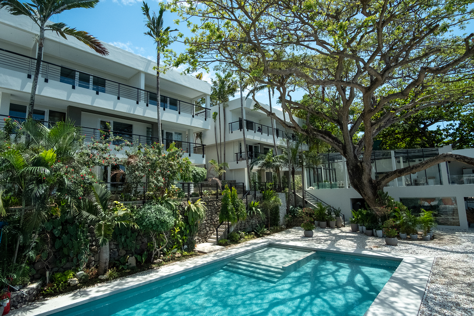 Die große „Garden View Suite“ und die „Deluxe“ Zimmer in den beiden dahinter gelegenen Gebäuden haben Blick auf den hübsch angelegten tropischen Garten.