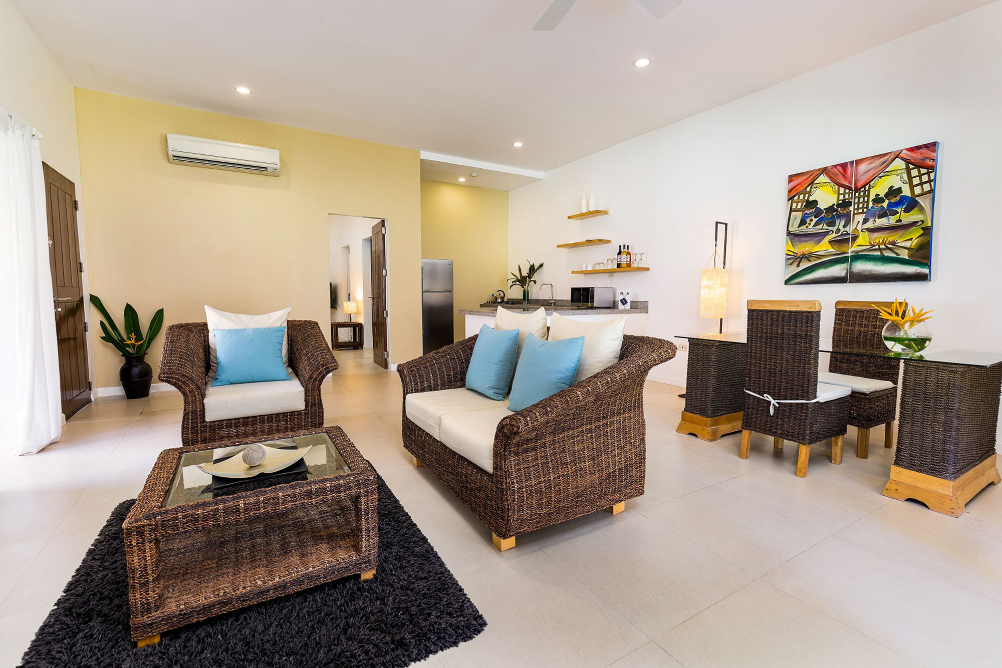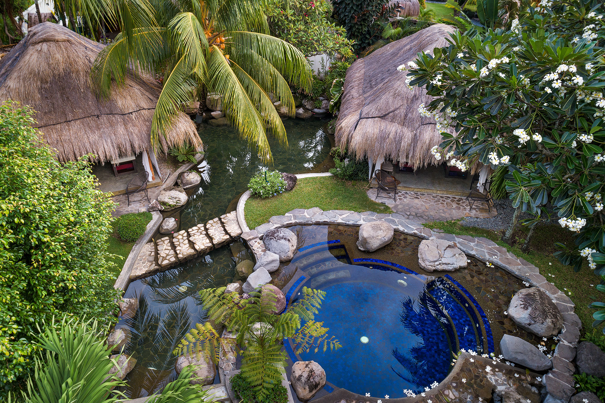 Alle Zimmer verfügen über Klimaanlage, eine eigene Terrasse, LCD-TV, Minibar, Kleiderschrank, Schreibtisch und einem gemütlichen Sofa. Die halb im Freien gelegenen Bäder sind alle mit Haartrockner, Bademäntel und einer Regendusche ausgestattet.
