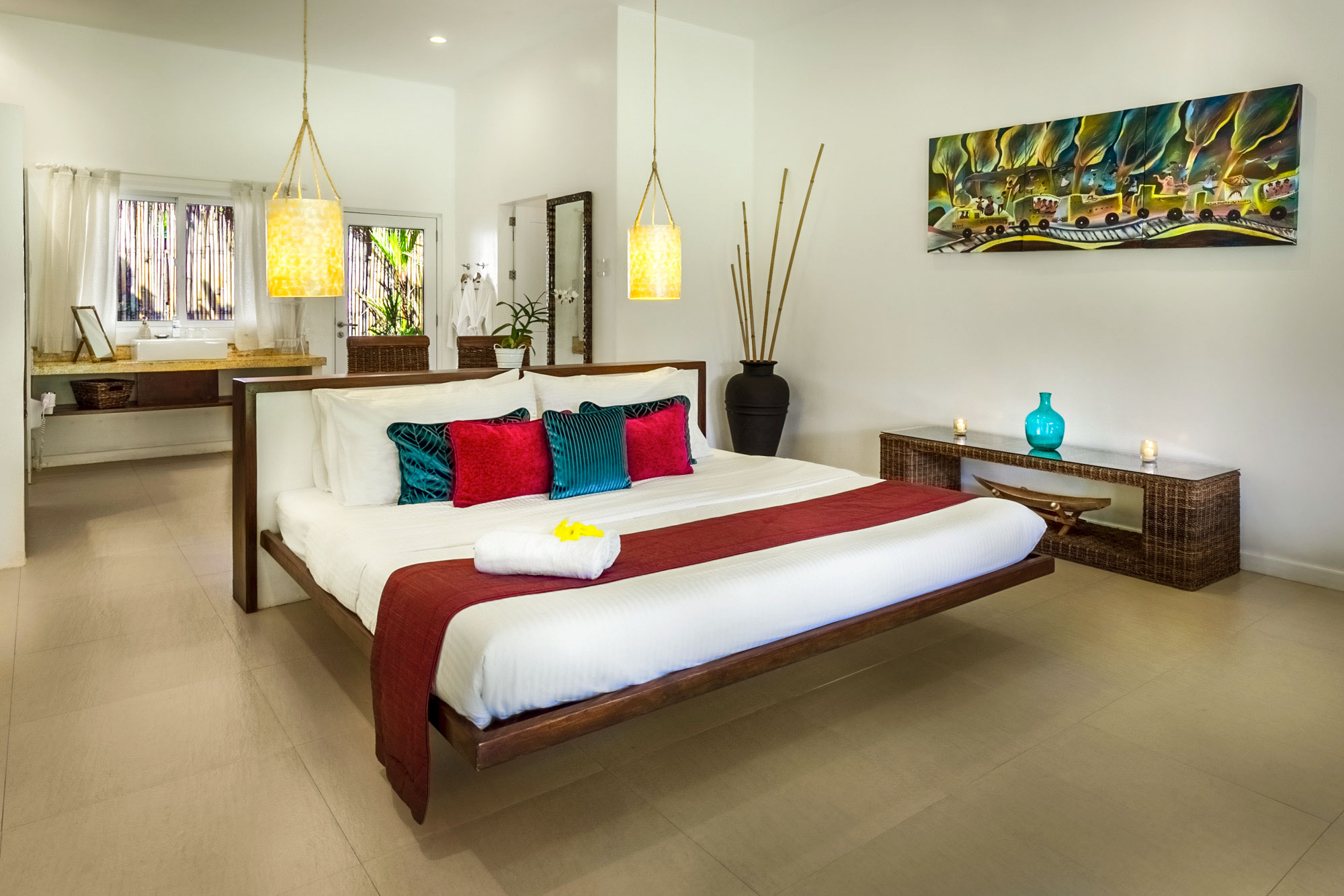 Die 14 modern eingerichteten Deluxe Suiten haben eine Größe von 65m² und sind ausgestattet mit einem Doppelbett und einem Einzelbett. Eine Veranda mit Sofa und Hängematte mit Blick in den Garten lädt zum Verweilen ein. Das großzügige Badezimmer ist halboffen mit außenliegender Regendusche.